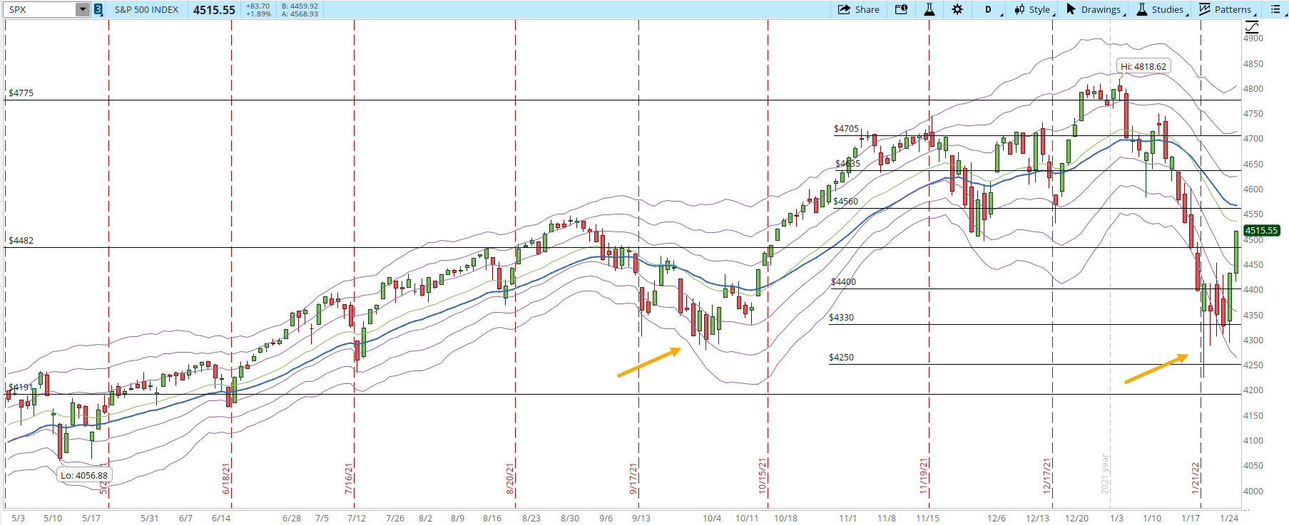 Reviewing the daily chart below of the last 9 months of the S&P 500, we can see that the Correction (at least up until now), reached a similar level than in Oct/2021 (orange arrows). The last two bars of the daily chart are tall and both closing at the highs of the session, different from the days before those two bars, where the S&P tried to rally and couldn't hold the gains to the end of the session.