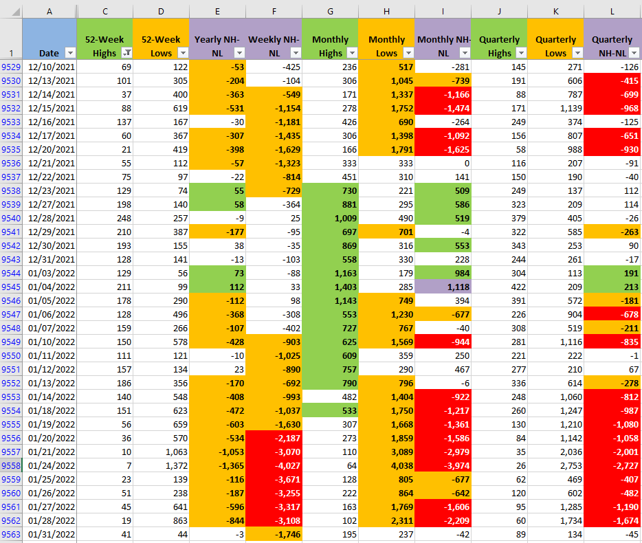 Another encouraging measure that I discussed in my last Weekend Market Overview post, is that the New Highs and New Lows number would reflect the force of Bulls and Bears. Today the numbers for the New Highs didn't really increased much in any timeframe, but the numbers of New Lows in all the timeframes dramatically decreased.