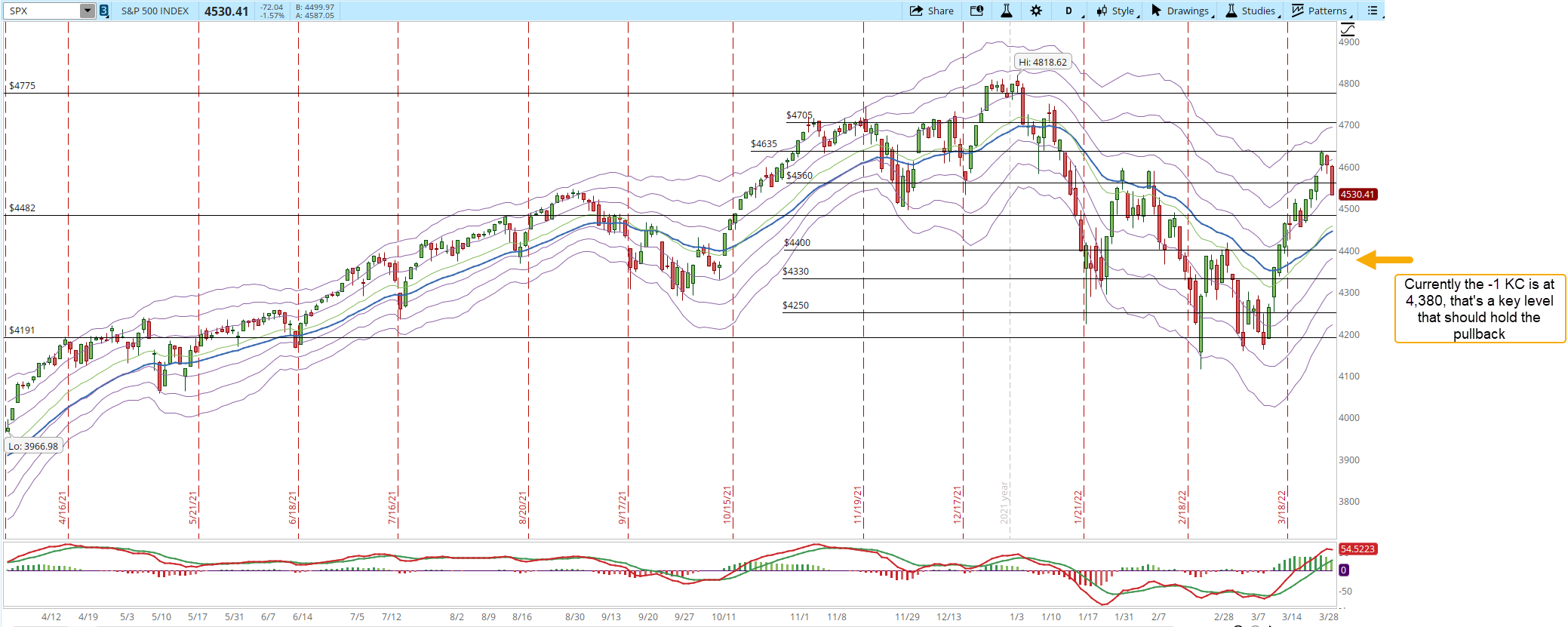 There are no guarantees in the Market, the fears of a recession, the Ukraine war, the virus, tensions with China, they are all news that at some point added selling pressure to the Markets and can continue to do so. If the S&P 500 breaks below the -1 KC and continues declining, risk management is the only tool we have in order to limit the damage to our accounts.