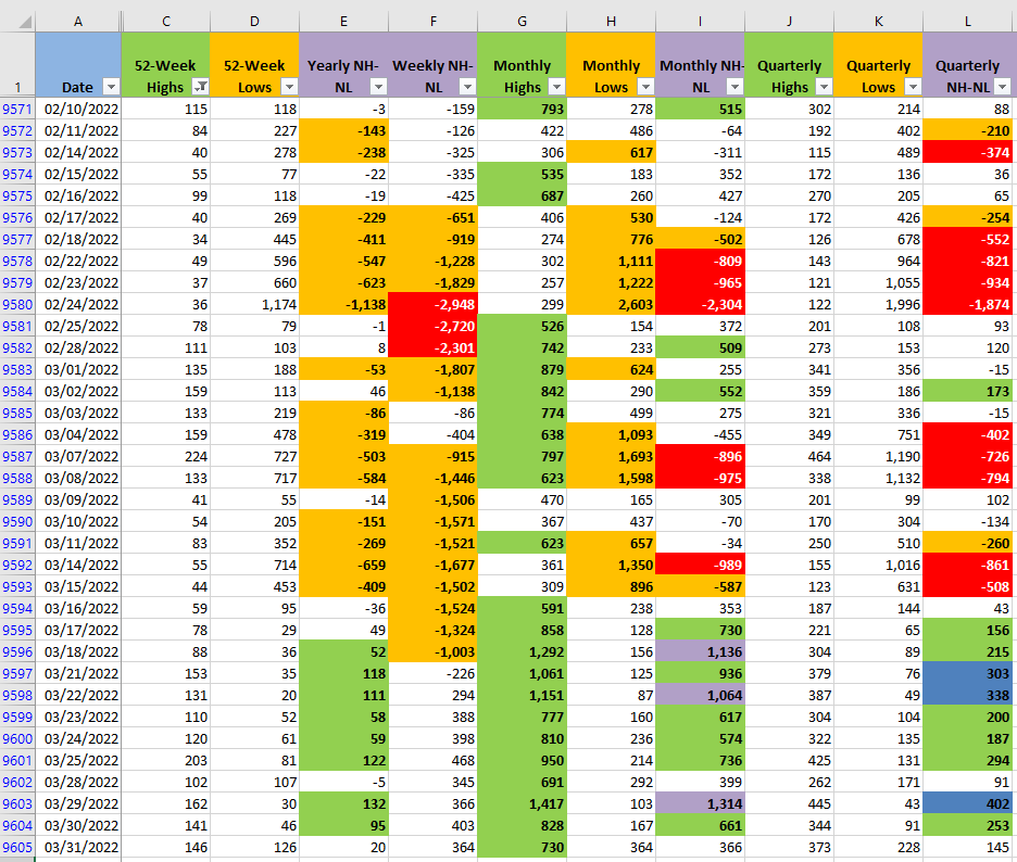 The numbers for the New Highs and New Lows (NH-NL) moved to a more neutral position, which is expected during a pullback. As long as the Monthly Lows (column H) don't get too elevated (more than 500) then the selling pressure will be still manageable and eventually the rally would have a chance to resume.