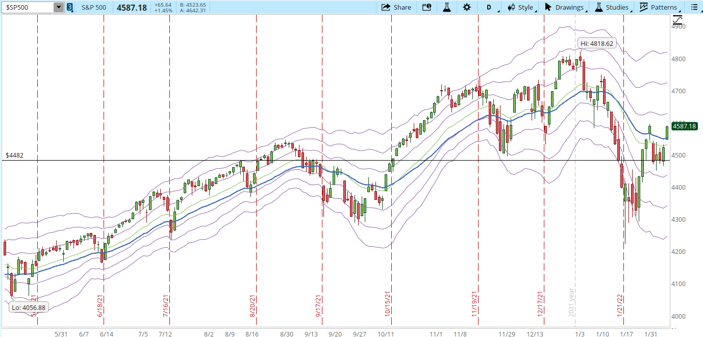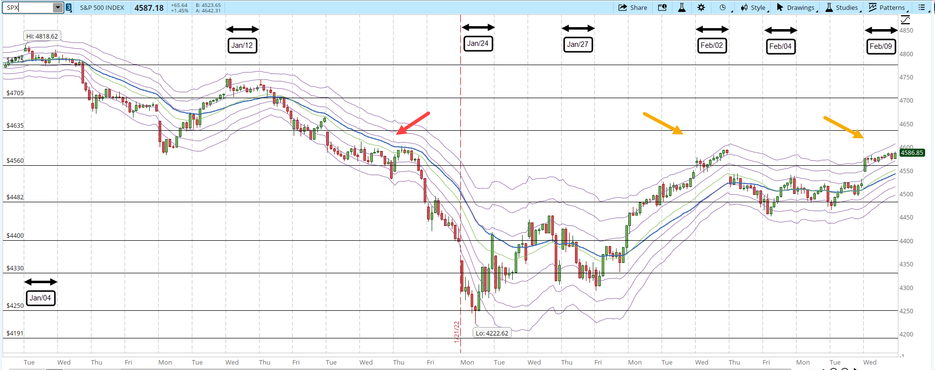 The same level is now serving as resistance, a week ago, on Feb/02 the S&P gapped up and then the next day it went down. Today we get the same behavior, another gap up that can't get past the 4,600 level (orange arrows).